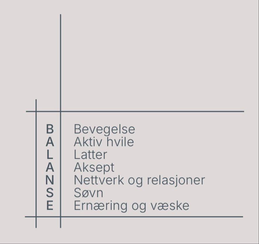 S for Søvn og hvile. Kvalitetssøvn og tilstrekkelig hvile er nødvendig for kroppens evne til å restituere og håndtere stress.